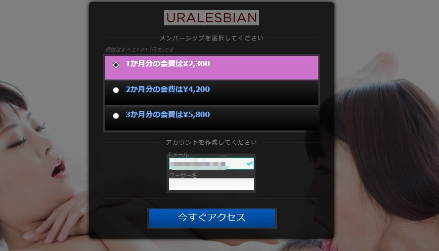 希望の会費プランを選択、アカウント作成のメールアドレスと任意のユーザー名を入力し、「今すぐアクセス」ボタンをクリックします。